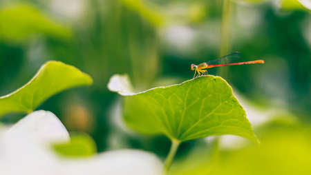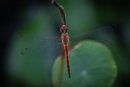 Crocothemis annulata scarlet dragonfly of this common dragonfly in Thailand perched on top of a lotus stalk in natural light, Nature background
