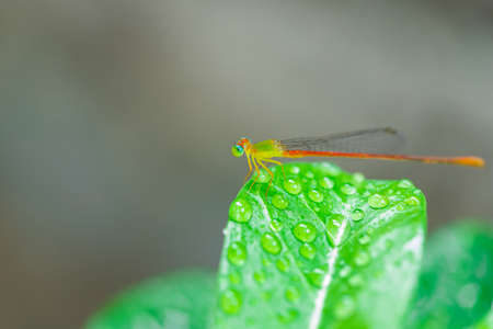 Dragonfly (focus on the eyes) perched on leaves with dew drops