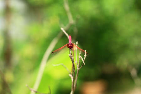Red dragonfly perched on the tip of a dry branch and blur the background.