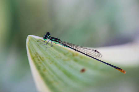 A close up of a dragonfly perched on a leaf in Side, Turkey.