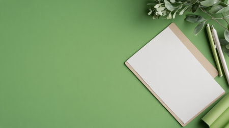 A workspace features a green backdrop with a clipboard holding blank paper, a pen for notes, and stylish glasses beside a small potted plant, creating a fresh atmosphere for productivity.