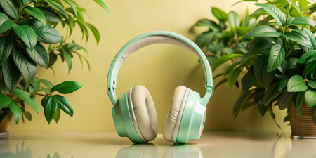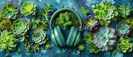 Green headphones rest amidst a lush arrangement of succulents, creating a tranquil and natural scene.