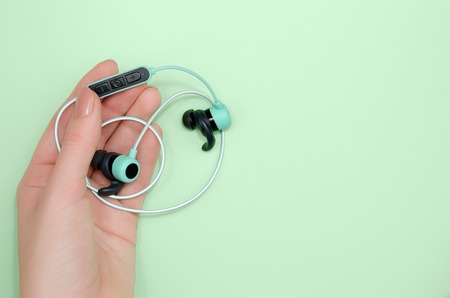 Bright green headphones for the player on a similar green background. Monochrome concept for website design, postcards, advertising.