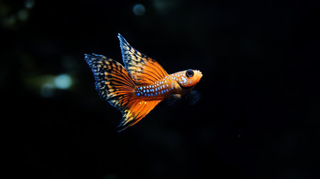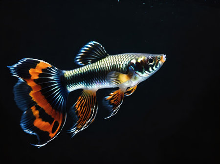 Fish in aquarium. Beautiful Guppy glides gracefully, its shimmering colors like strokes of living light. Each delicate fin flows like silk in water. Guppy isolated on black.