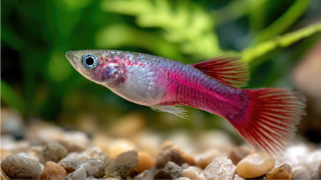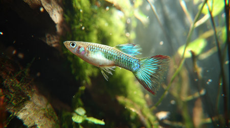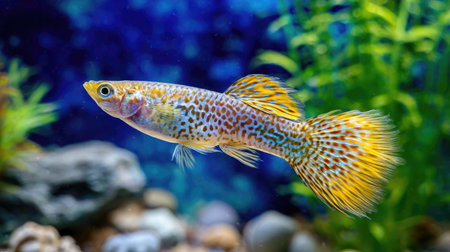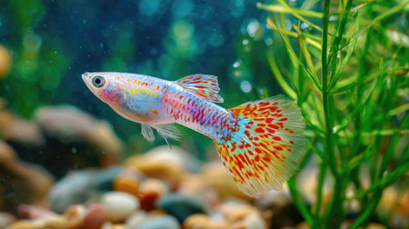 Vibrant Guppy Swimming Gracefully in Tropical Underwater Environment with Colorful Plants and Natural Decor