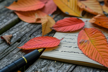 Open notebook with a pen, surrounded by colorful autumn leaves on a wooden backdrop