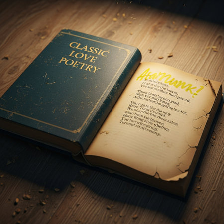 An editorial, wide-angle photograph capturing an antique hardback copy of 'Classic Love Poetry' open