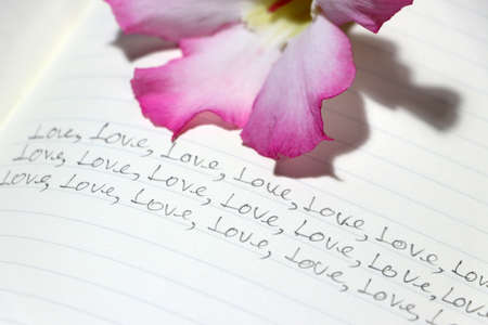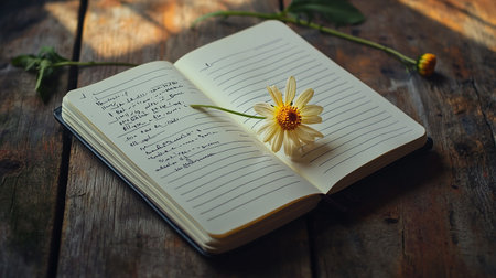 Flower and notebook on a wooden background. Vintage style, selective focus.