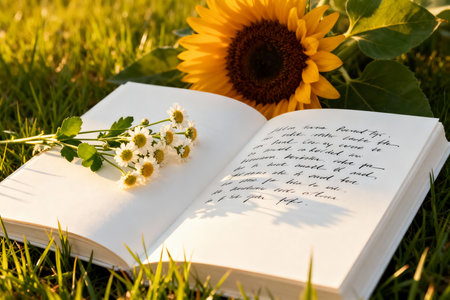 Handwritten notes are spread across an open book, lying in a grassy field under a beautiful sunset.