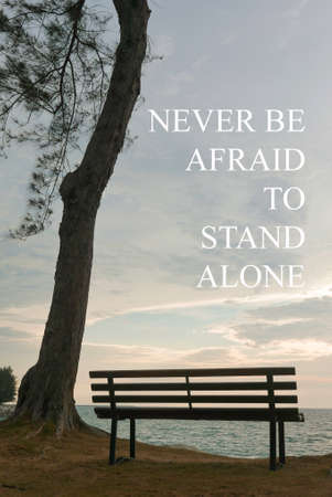 Inspiration motivational quotes with single bench and a tree on a hill during sunset. Never be afraid to stand alone.