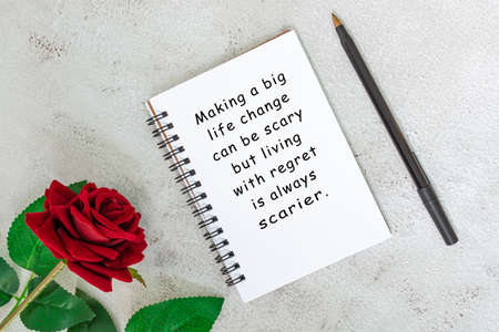 Motivational quote on a note book with roses on a desk. Making a big life change can be scary but living with regret is always scarier.