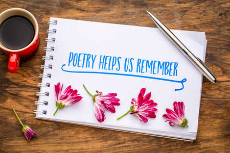 poetry helps us remember inspirational note - handwriting in a spiral sketchbook with flowers and coffee on a grunge wooden table
