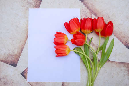red tulips and white blank sheet of paper lie on the background in vintage style