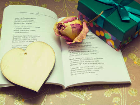 preparation for Valentines Day: a poem, a wooden heart, dried roses and a box with a gift