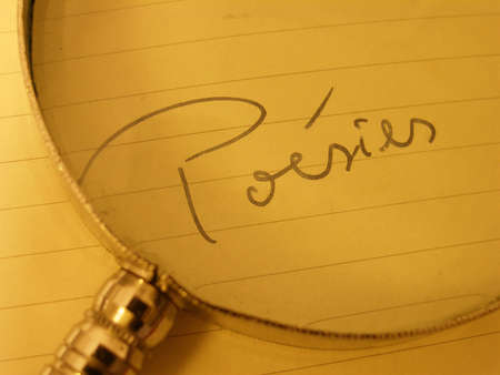 Monochromatic photo of a notebook with the handwritten text 'Poetry day.' Symbolizes creativity, literature, and writing.