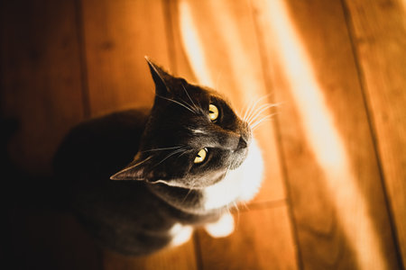 A gray domestic cat is sitting on a wooden floor inside a house, bathed in sunlight, and looking up at its owner. The companionship, warmth moments shared between humans and their animal companions.