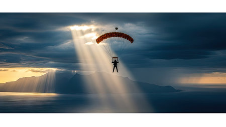 Paraglider flying high in the sky with sunbeams