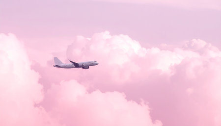 An aircraft soars through a colorful sky, leaving a white contrail. The scene showcases an airplane against a backdrop of pink and blue hues. The image, featuring clouds and sunlight, may be suitable for aviation, travel, or commercial projects. The graphic has a smooth texture.