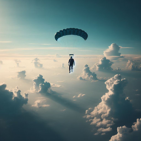 A skydiver is captured mid-air during a jump above the clouds, with the sun shining above him, creating a sense of adventure and freedom.
