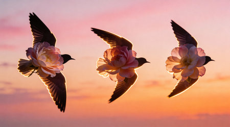 A creative digital illustration depicting Bird silhouettes morphing into blooming flowers against dawn sky, transitional layered composition, subtle rim lighting with glow, poetic abstract photography, transformative beauty mood, detailed pro. This AI-generated artwork features unique visual elements suitable for various commercial and editorial applications. AI-generated illustration.
