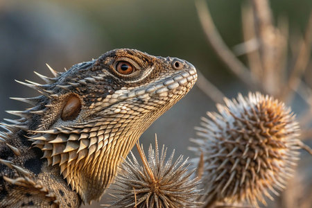 Close-up of a spiny lizard's head and neck, looking upward, amid dried thistle plants.