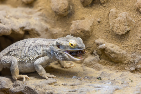 A bearded dragon (Pogona sp) is showing aggressive behavior.