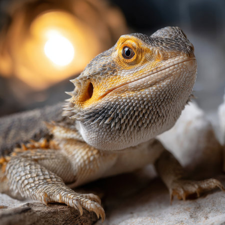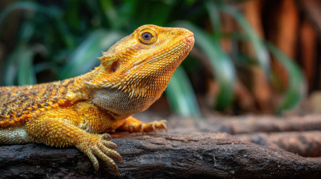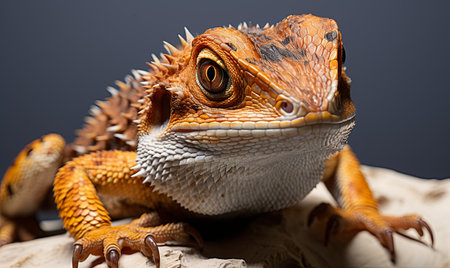 A stunning macro photograph captures the intricate details of a vibrant bearded dragon. Bathed in warm, golden light, its orange and yellow scales create a mesmerizing texture, while its watchful eye suggests a calm and ancient wisdom. This image embodies the quiet majesty and exotic beauty of the reptile world.