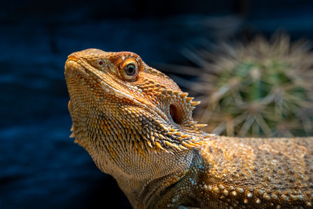 close-up of a colorful pogona in a vivarium. green bokeh in the background with cactus.