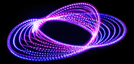 Vivid abstract image showcasing dynamic light trails in blue and orange, creating a mesmerizing circular pattern against a dark background, perfect for creative projects.