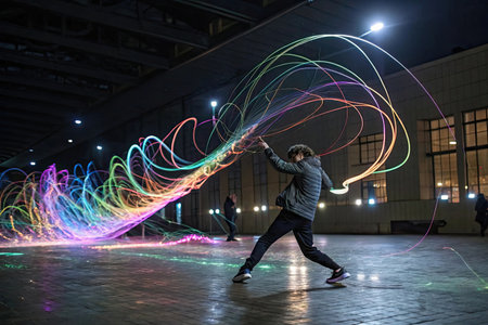 A captivating long-exposure photograph captures a juggler skillfully manipulating glowing LED clubs in the dark. The movement creates a complex and beautiful pattern of swirling, multi-colored light trails, illustrating motion, skill, and dynamic energy.