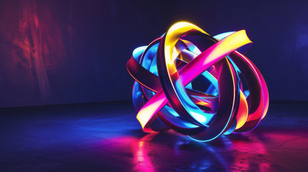 A vibrant neon sculpture with intertwined rings in a dark studio setting. The sculpture is lit with colorful neon lights, casting shadows on the floor.