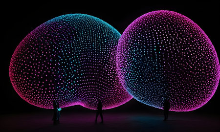 People observing colorful illuminated balls floating in dark spacious room of modern art gallery. Ai generated image