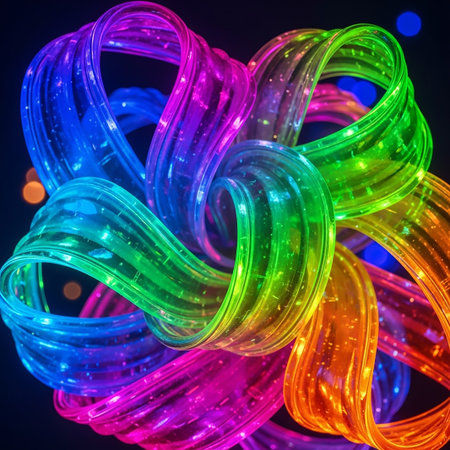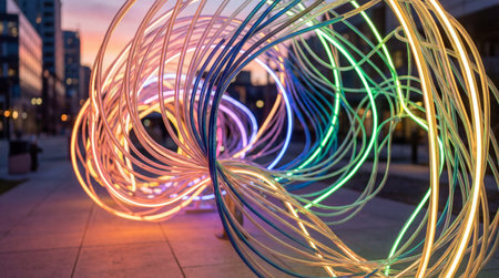 Abstract swirling shapes formed by vibrant, colorful light tubes in a spectrum of blues, greens, pinks, and oranges, creating a luminous and energetic visual.