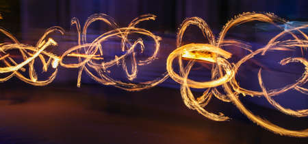 Person doing Fire Show Flaming Trails. Long exposure fire trail on a diwali fire show.