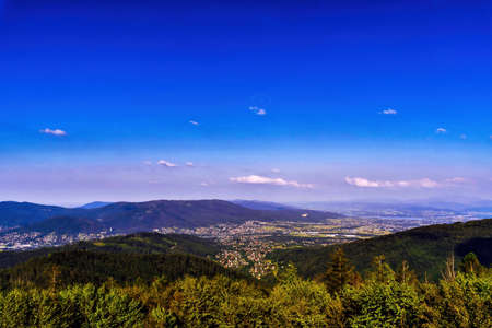 Bielsko Biala, South Poland: Wide angle from up above panoramic detailed high definition view of scenic mountains, green forest and city against blue sky