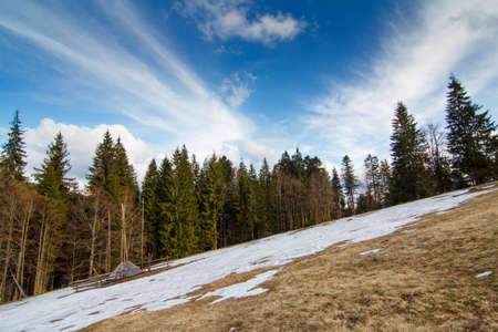 Mountains, coniferous forest in the snow, spring, winter
