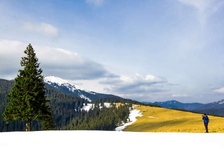 Lonely photographer in mountains taking the picture of a lonely pine tree in winter day