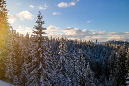 Aerial winter landscape with spruse trees of snow covered forest in cold mountains in the evening.
