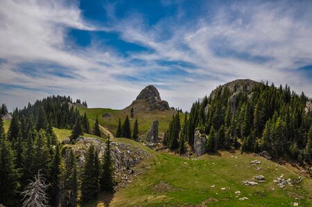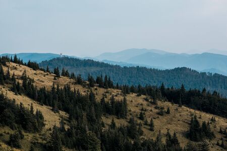 Pine trees in the evergreen forest resort with a meadow of Zlatibor nature reserve, Serbia, Europe on a summer day. Beautiful natural background