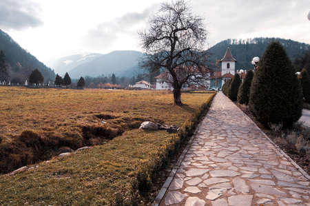 Alley leading to Brancoveanu Monastery in Brasov county Romania, also called Sambata de Sus monastery, with mountains seen in the background.
