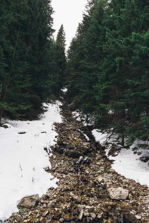 Snowy mountains, coniferous deforestation, a spring, a winter