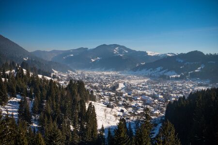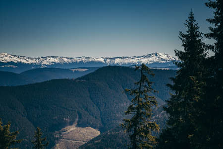 Winter landscape with Carpathians mountains on clear sunny day, Romania.