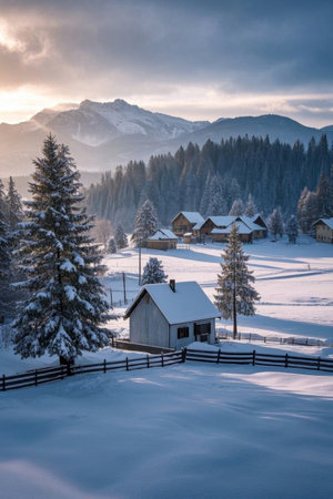 houses in the hills, sunny day, beautiful blue sky, mountains and trees in the snow, beautiful