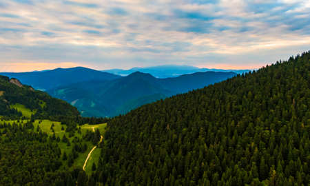 Aerial view to Mala Fatra mountains in Slovakia. Sunrise above mountain peaks and hills in far. Beautiful nature, vibrant colors. Famous tourist destination for hiking and trekking. Cloudy weather