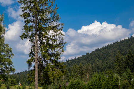Beautiful Carpathian ukrainian village between trees in coniferous forest with mountains and blue sky view