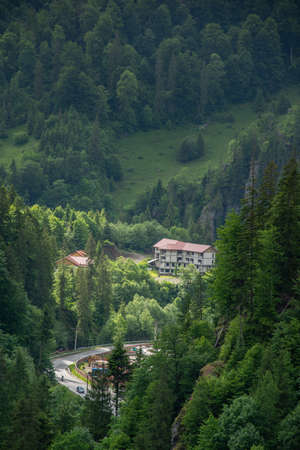 Aerial photo of beautiful mountain Krivopol pass Carpathians, Ukraine. Drone filmed an alpine landscape with coniferous and beech forests, houses, around a winding serpentine road