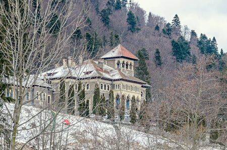 The Cantacuzino Palace (Palatul Cantacuzino) from Busteni, Romania, winter time with snow and ice.