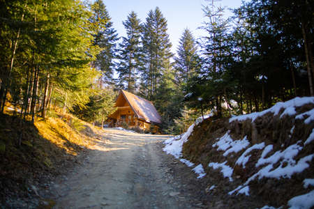 Snow covered trees in winter forest with wooden house.