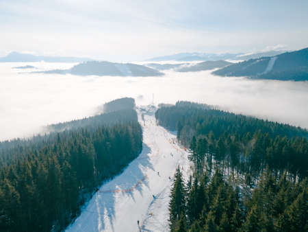 aerial view of ukrainian ski resort in carpathian mountains