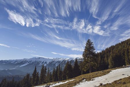 Sunny alpine winter scenery with fluffy cirrus clouds formation seen from Zanoaga meadow in Piatra Craiului mountains, Romania.